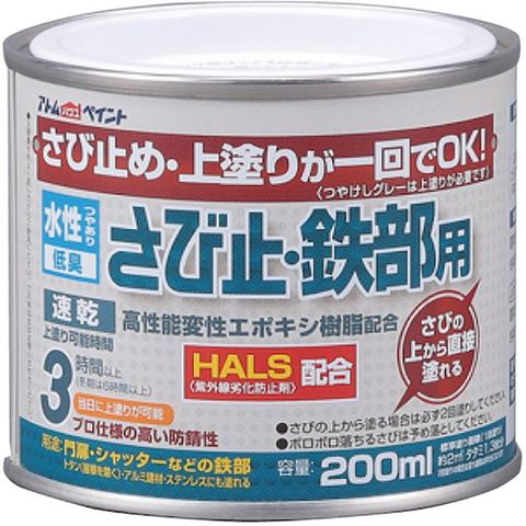 ・性:水性つやあり(つや消しグレーは除く)。・希釈剤:通常不要・濃いときは水道水で5%以内。・塗回数:1回塗り(さびの上は2回塗り)。・さびの上から直接塗れる優れた防錆性とHALS(紫外線劣化防止剤)配合により、長期耐久を実現しました。・エポキシ変性樹脂使用で、鉄だけでなくアルミ建材やステンレスにも塗れます。