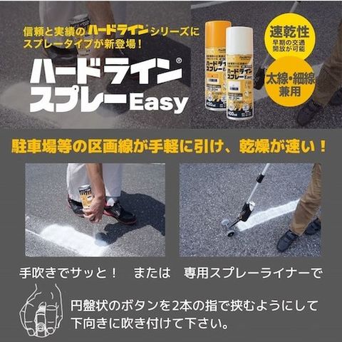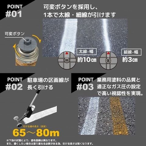 ・1本で太線(約10cm)、細線(約3cm)が両方引けます。・公道で使用されている専用原料から作っていますので、視認性に優れています。・着色力の強い塗料と適度な噴射圧とのバランスで、アスファルトの凹面にもしっかり着色できます。・超速乾なので、塗装後最短10分で交通開放できます。・円盤状のボタンを2本指で挟むように押すことで、手でも吹けます。