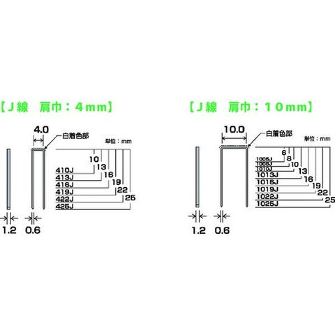 ・規格:1016J・肩幅(mm):10・足長(mm):16・色:無地・適合ステープル肩幅×長さ(mm):10×16・幅(mm):1.2・全長(mm):16