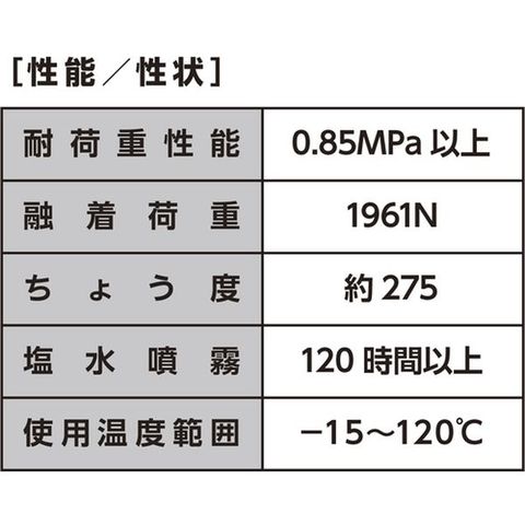 ・白色極圧浸透グリース(白色固体潤滑剤配合)・浸透性があり、細部にグリースが行き渡ります。・シールチェーン等のOリングに影響がありません。・密着性に優れ、飛び散りが極端に少ない。・耐水、耐酸、耐アルカリ性に優れます。・水がかかっても性能が低下しません。・白色固体潤滑剤配合で極めて強い潤滑性と極圧性をもっています。