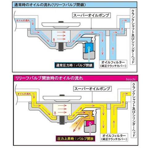 SP武川製スーパーオイルポンプは吐出量を純正比約50%増加し、不安定なアイドリング時の油圧確保と回転上昇に伴う油圧の変化に対応する為、オイルラインに一定の油圧に達した時のみバルブが開く、リリーフバルブ機能を設置しております。