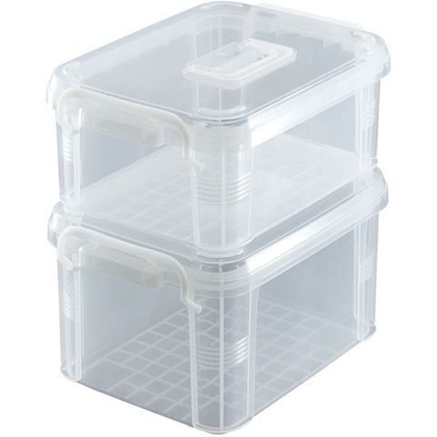 ・ハンドル付きで持ち運びやすい収納ボックスです。・350ml缶が6本入るサイズ感です。・フタ付きでしっかりロックできるので、中身が飛び出すことがないです。・書き込みやすいインデックス紙ラベル付きで仕分けも簡単です。・中身が分かりやすいクリアタイプです。・お手入れのしやすいプラスチック製です。