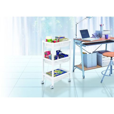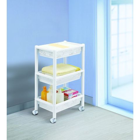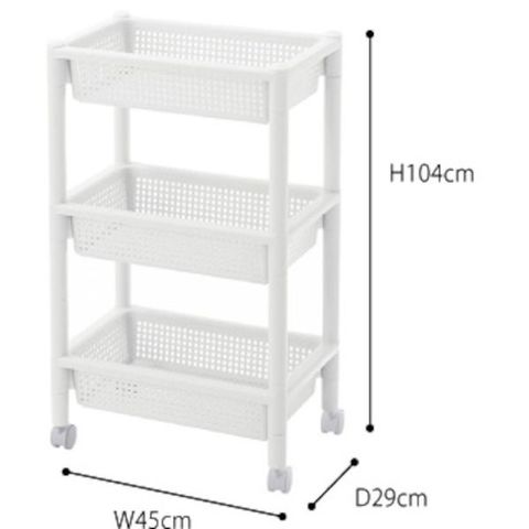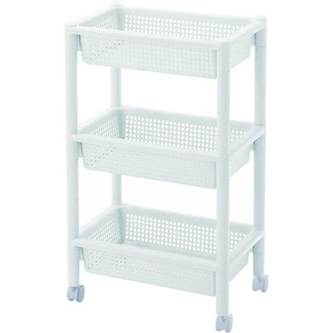 ・丈夫でお手入れのしやすいプラスチック製3段タイプのワゴンです。・バスケット棚はA4サイズがスッキリ収納でき、デスクサイドでも便利です。・リビングやキッチン、デスク周りなど場所を問わずお使いいただけます。・キャスター付きで移動もラクラクです。・工具不要、簡単組み立て式です。