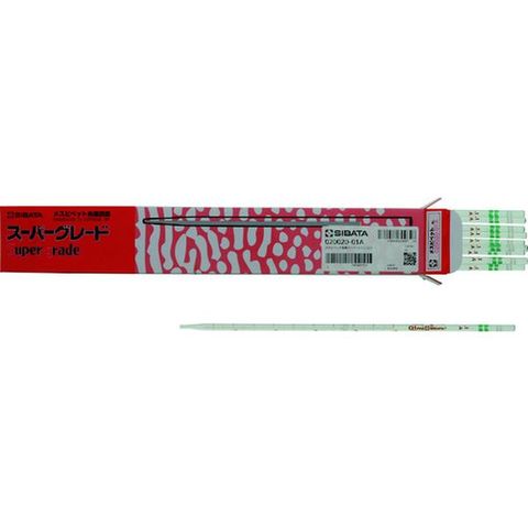・一定の体積の液体を量りとるために用いられます。・JIS R3505クラスAの「体積の許容誤差」より高精度です。・ストレートな管に目盛が複数表示されています。・同容量のホールピペットより目盛の精度は低いが、目盛が複数あるので、汎用性があります。・目盛は排出体積、目盛まで液体を吸い上げ、全量を排出したときの体積を表す。出用を意味するTDを表示しています。(TD:To Deliver の略)・目盛は20℃の水を測定したときの体積を表しています。・JIS規格(R3505)では、高精度のクラスAと標準のクラスBが規定されています。・JISクラスAの許容誤差の「カスタムA」とクラスAを上回る高精度の「スーパーグレード」の2種類があります。・液切れのよいガラス素材DUROBAX(R)を採用しています。