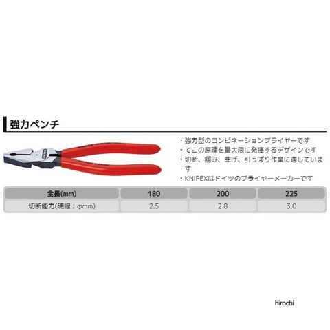 クニペックス KNIPEX 強力型ペンチ 180mm プラスチックコーティングハンドル