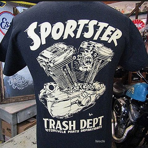 スポーツスターエンジンがバックプリントされたTRASHDEPTオリジナルTシャツ。