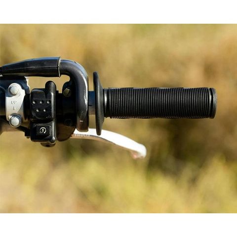 ビルトウェルのオフロード風なMOTOグリップです。ミディアムコンパウンドの素材を用いる事により、程良い硬さと耐久力を増しているのが特徴です。大きめのフランジにより不意にスイッチへ手が触れてしまうのを防いでおり、グリップの端にはワイヤー用の溝が設けられている安心の仕様です。