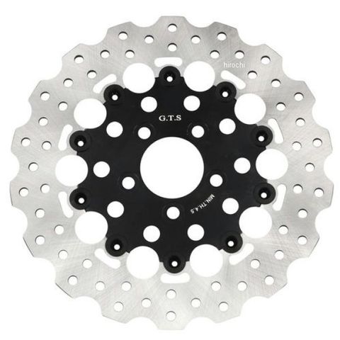 GTSのフローティングディスクローターです。アウターローターがウェーブカットされている為、見た目も制動力もアップ!フローティングローターはリジット固定に比べ、ロータに生じる車軸方向の応力が軽減されるため、熱変形が抑えられる他、ハブやホイールに伝わる熱を軽減させるなど、メリットが豊富です。レーザーカット加工で精密に仕上げられ、軽量化のためインナーとコネクトピンはアルミが使われています。