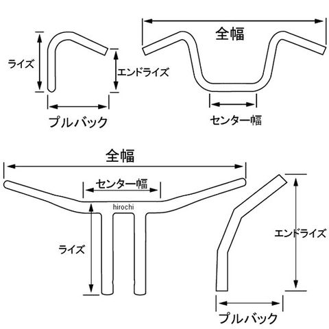 ハンドル径 7/8インチ(22mm)、エンドドロップ 4.5インチ(114mm)、全幅 27.5インチ(699mm)、センター幅 6.5インチ(165mm)、プルバック 0インチ
