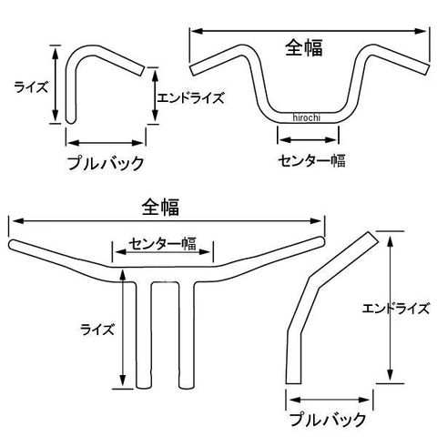 ハンドル径 7/8インチ(22mm)、エンドライズ 10.5インチ(127mm)、全幅 28インチ(711mm)、センター幅 6インチ(152mm)、プルバック 11インチ(279mm)