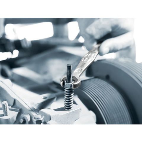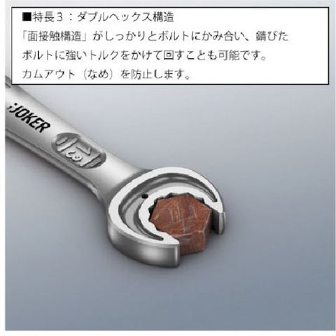 ・スパナ部分の特殊なプレート構造により、ナットやボルトが落ちることがありません。・スパナでボルトをはさんだまま横向きで狭い箇所に挿入したり、上から力を入れて押さえながら、強いトルクでボルトを回すことができます。・スパナ部分の「ダブルヘックス」構造は、通常のスパナでは回すことができない、なめたり、サビたボルトを回すことができます。・ギア部分は80枚でスムーズな動きを可能にしています。・30°の小刻みなリターンアングルを実現しています。