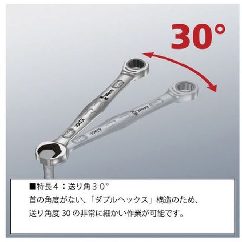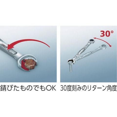 ・スパナ部分の特殊なプレート構造により、ナットやボルトが落ちることがありません。・スパナでボルトをはさんだまま横向きで狭い箇所に挿入したり、上から力を入れて押さえながら、強いトルクでボルトを回すことができます。・スパナ部分の「ダブルヘックス」構造は、通常のスパナでは回すことができない、なめたり、サビたボルトを回すことができます。・ギア部分は80枚でスムーズな動きを可能にしています。・30°の小刻みなリターンアングルを実現しています。