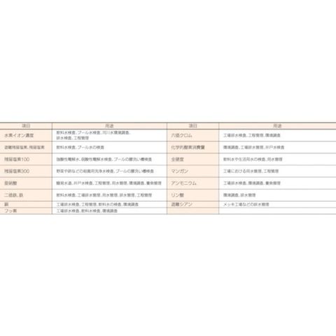 ・簡単操作のシンプルパックで容易に水質検査ができます。・手のひらに入る小型の容器ですので、かさばらず軽量です。・試薬の入った容器に検水を吸い込み振った後、10秒~数分で反応が完了します。・検水を吸い込み、色を比較するだけですので、特に専門的な経験や知識を必要としません。
