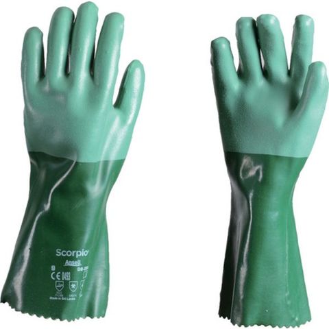 ・色:グリーン・サイズ:L・全長(cm):35.5・手のひら周り(cm):27.8・中指長さ(cm):8.0・厚さ(mm):0.11・EN374規格:メタノール、水酸化ナトリウム(苛性ソーダ)40%、硫酸(96%)・EN ISO 374-1:2016規格:Type A - AKLMNOPT