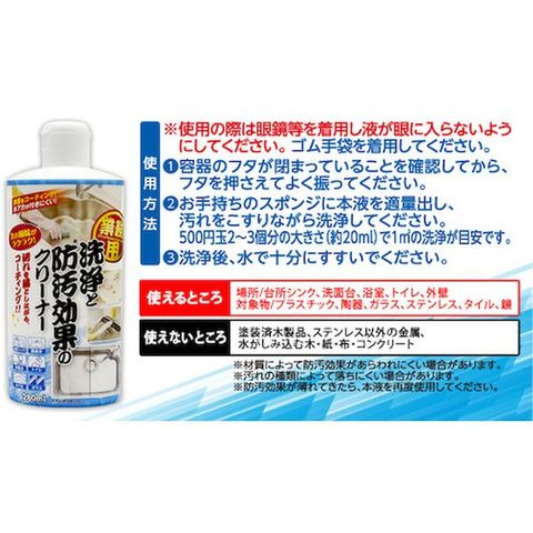 ・汚れを落としながら表面コーティングすることで、水アカなどの汚れをつきにくくするクリーナーです。・台所シンク、洗面台、トイレ、お風呂など水周りのお掃除に使えます。・窓ガラス、鏡のお掃除にも使えます。・次の掃除が楽になります。