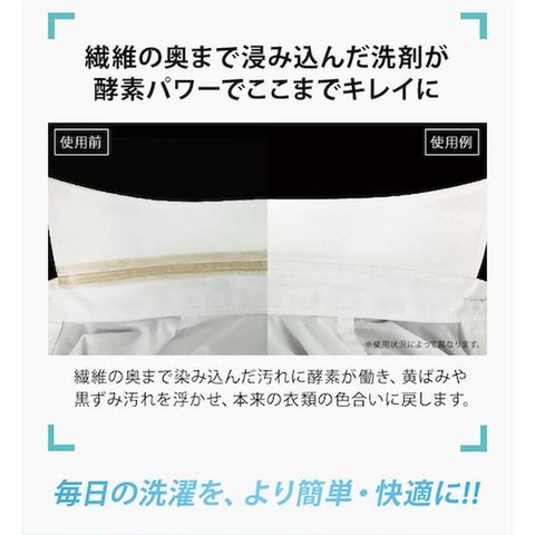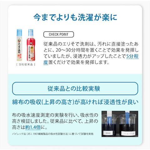・落ちにくいエリやそでの嫌な汚れを落とします。・自社従来品と比較して、浸透力が1.4倍アップし、時間が経った汚れも落ちやすいです。・幅広の塗口に改良し、サッとひと塗り。皮脂汚れには酵素が働く。