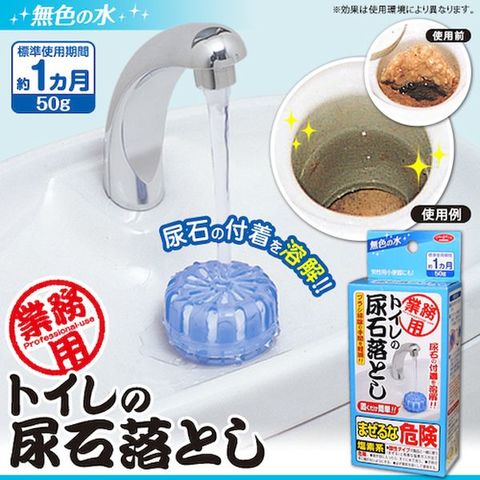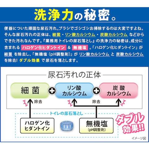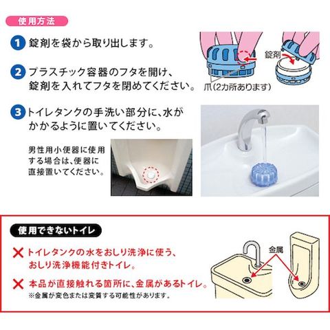 ・置くだけ簡単、尿石の付着を溶解しブラシ掃除の手間を軽減します。・継続使用で、水あか、キバミ汚れが付きにくくなります。・タンク内の器具や防露タンク、浄化槽内に影響を与えにくいです。・おしり洗浄機能付きトイレにもお使いいただけます。・男性便器にも、トイレタンクにも利用可能です。