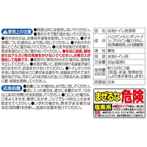 ・酸性タイプの製品と一緒に使う(まぜる)と有害な塩素ガスが出て危険です。・トイレタンクの水をおしり洗浄に使うタイプは使えません。