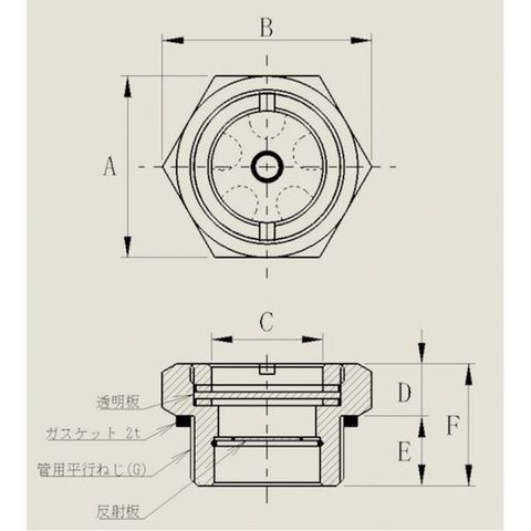 ・厚さ(mm):17.5・取付ねじ径:G3/4・耐圧(MPa):1.5(40℃)・耐熱温度(℃):130・二面幅寸法(mm):32・幅(mm):37・A(mm):32・B(mm):37・C(mm):20・D(mm):7.5・E(mm):10・F(mm):17.5