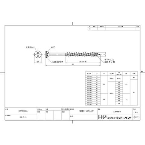 ・寸法(mm)d:3.3・全長(mm):50・ねじ部長さ(mm):35・タイプ:半ネジ・頭部径dk(mm):6・パック入数(本):78