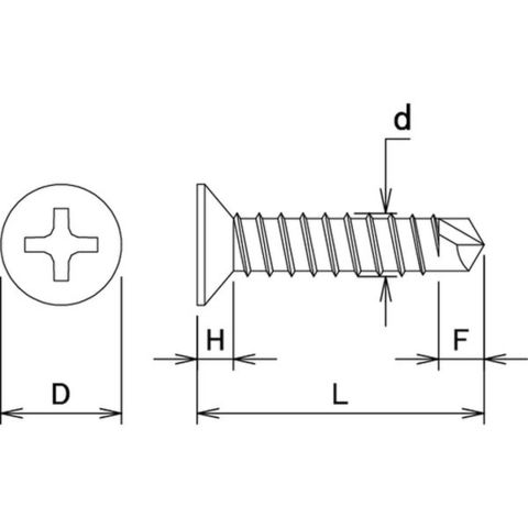 ・寸法(mm)d:4.8・寸法(mm)L:13・最大適合板厚(mm):1.6~2.3・頭部径(mm):9.1・頭部厚さ(mm):2.8・適合ドライバー:十字No.2・ドリル刃先(mm):5・呼び径(mm):4.8・長さ(mm):13・品名:十字穴付き皿 ドリルねじ・呼び寸法(mm)d:4.8・全長(mm):13・鉄板板厚(mm):1.6~3.2・呼び寸法(mm)L:13