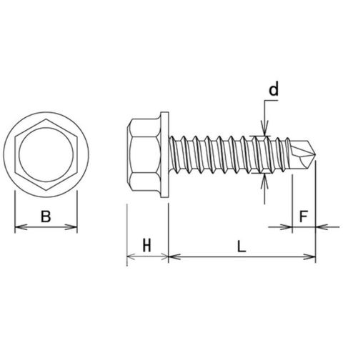 ・寸法(mm)d:4.8・寸法(mm)L:45・最大適合板厚(mm):1.6~4.5・頭部径(mm):10.2・頭部厚さ(mm):4.1・首下長(mm):45・ドリル刃先(mm):7・呼び径(mm):4.8・長さ(mm):45・品名:つば付き六角 ドリルねじ・呼び寸法(mm)L:45・呼び寸法(mm)d:4.8・鉄板板厚(mm):1.6~4.5・対辺(mm):8