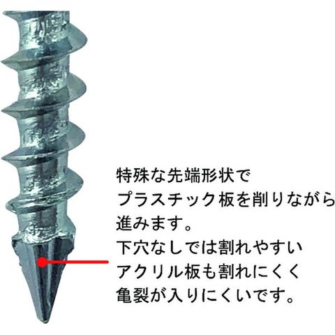 ・特殊な先端形状で板を削ることにより、下穴なしでは割れやすいアクリル板も割れにくく亀裂が入りにくいです。・板を削る際に排出される削りカスが取れやすいので仕上がりがきれいです。・板厚5mmまでのプラスチック製品に対応しているので、いろいろなプラスチック製品を取り付けることが可能です。・(海外製等、一部下穴が必要な場合あります)
