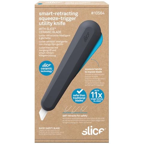 ・刃先を出すためにボタンを引いたり押したりする必要があり、作業中に指に疲労が溜まりやすいという従来のカッターの構造に注目し、本体を握るだけで刃先が出るようにしました。・エルゴグリップ式 スマート収納テクノロジーにより、切削表面から刃先が離れると、本体を握っている状態でも、刃が自動的に本体へ収納される安全設計となっています。・段ボールの開梱、芯入りワイヤーを剥く作業、PPバンドのカット、その他一般用途でもご使用いただけますので、初めてセラミックカッターをご使用予定の方にオススメの製品です。・本体にラウンドタイプ(10526)の刃が組込まれております。・刃先の向きを変えることで、左右両利き対応となります。・両端刃先の構造ですので、刃先交換時期が来ても1枚で2度ご利用いただけます。・替刃の交換は工具不要で簡単に行えます。・切削物から刃が離れると刃先が自動で本体に収納されるエルゴグリップ式(10564)と、本体から手を放すと刃先が本体へ収納される刃先自動収納式(10563)があります。