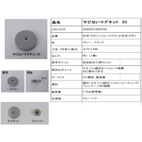サビないマグネット シリコン NCW-30R 黒 強力マグネット ネオジム磁石 M3のレビュー