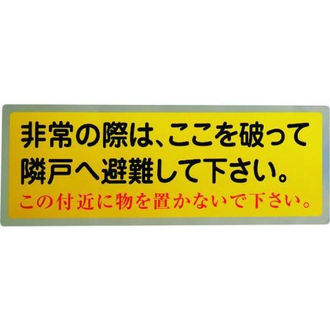 ・表示内容:非常の際は、ここを破って隣戸へ避難して下さい。・取付仕様:テトロンステッカー(強粘着)・縦(mm):150・横(mm):400・厚さ(mm):0.2・サイズ(mm):150×400・材質:テトロン