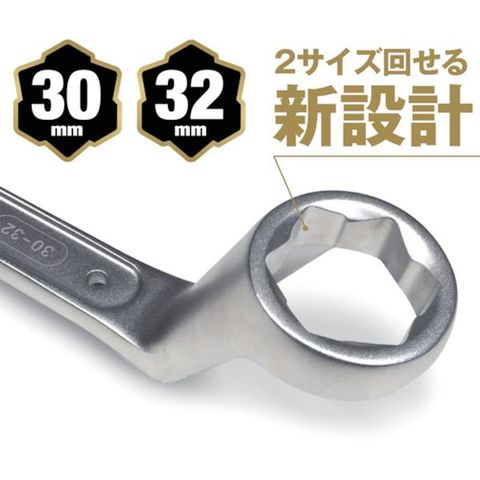 ・首角度は72°です。・メガネ部が独自形状となっており、30mmのボルトは角で、32mmのボルトは辺で回すことで、1本で2サイズのボルトナットに対応できます。・2サイズソケットなのに肉薄で軽く、持ち運びの負担を軽減します。・特殊機構のソケットで、ナットの角を傷めにくくなっています。