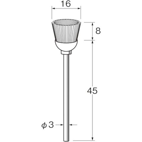 ・毛材:真鍮・外径(mm):16・毛丈(mm):8・軸長(mm):45・軸径(mm):3・最高使用回転数(rpm):15000