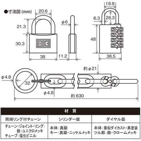 ・幅(mm):38・ツル径(mm):6・B(mm):21.3・C(mm):20.6・付属鍵本数(本):3・タイプ:シリンダー錠・チェーン長(mm):600・錠本体材質:真鍮