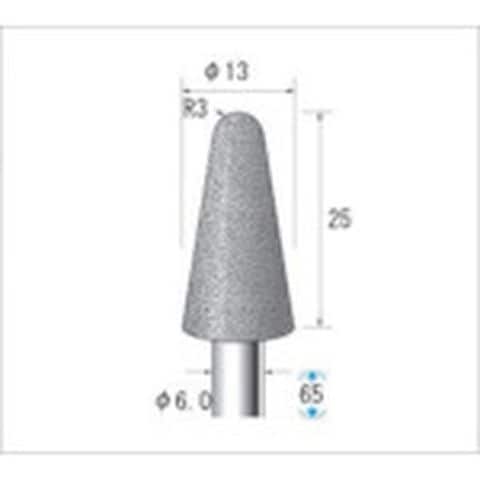 ・粒度(#):120・刃径(mm):13・刃長(mm):25・軸径(mm):6・全長(mm):65・形状:テーパー先丸・最高使用回転数(rpm):35000・先端曲部:R3
