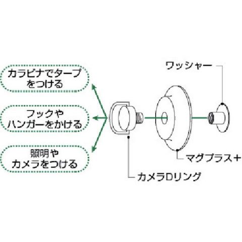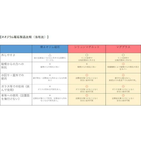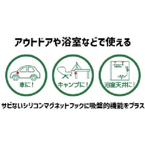 ・ネオジム磁石にシリコンの羽根を付けたマグネットマウント「マグプラス+」に、D型フックを装着した強力マグネットフックです。・磁石周囲の羽根の効果により吸着力がアップし、横からの力に強く外れにくく、耐荷重は約4.5kg。(弊社のシリコンマグネットと比較して4倍強く進化)・磁石をシリコン樹脂で完全被膜しているため、吸着面をキズつけにくく、サビにも強いです。・シリコン磁石の耐候性と耐水性を活かし、屋外や水中などハードな現場にも耐えうる取り外し可能なマグネットフックです。