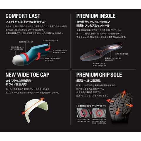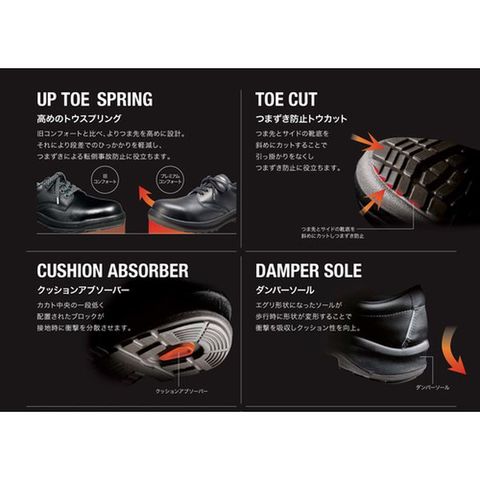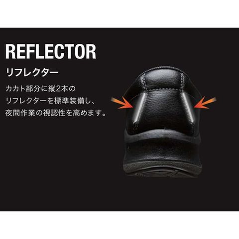 ・靴底から静電気を逃し、スパークを防止します。・靴型を刷新し、かかと・土踏まず部のホールド力を高めることで、優れたフィット感を実現しました。・アッパーに通気孔を設け、高い通気性を実現しました。・靴底のかかと中央部に一段低く配置されたブロックが接地時に衝撃を分散させます。・復元性とクッション性の高い、新素材プレミアムインソール搭載です。・つまずき防止のため、つま先とサイドの靴底を斜めにカットしました。・エグリ形状になったダンパーソールが、歩行時にかかとの衝撃を吸収します。・かかと部分に縦2本の反射材を配置しました。・最高レベルの耐滑性を誇り、耐久性にも優れる新型ソールです。