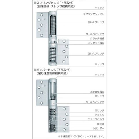 ・表面処理:アクリル樹脂焼き付け塗装仕上げ・取付方法:サラねじM6(別売)・適用ドア質量:60kg以下・適用ドア寸法:(幅)900mm以下×(高さ)2100mm以下×(厚み)30mm以上・自動温度補正機能付・防滴仕様・クローザー機能なし・セット内容:上下×各1枚・JIS A1510-3規格品
