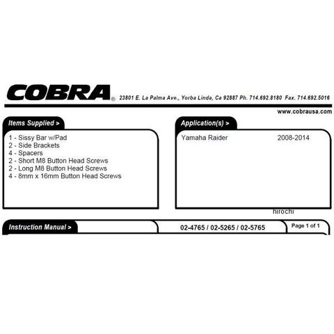 コブラ COBRA シーシーバー 08年以降 レイダー XV1900C ショート