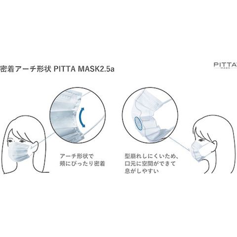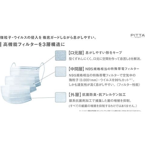 ・3層構造の高機能フィルターに、N95規格相当の特殊帯電フィルターを採用し、空気中の微粒子(0.0001mm)やウイルスを99%カットしながら通気性が高く、息がしやすいです。・密着アーチ形状で、マスクと顔の間に微粒子・ウイルスが侵入する隙間を作りません。・型くずれしにくく、口元に空間を作って息苦しさを解消します。