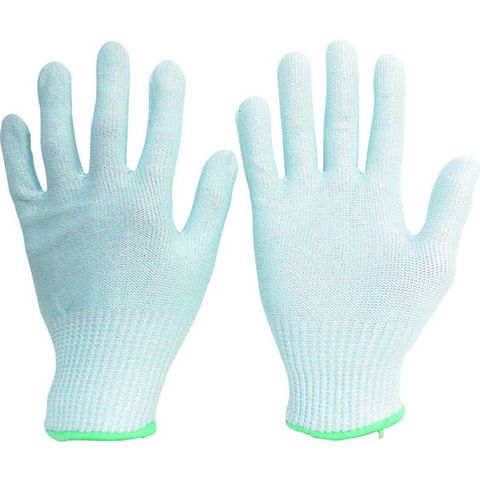 ・色:ブルー・サイズ:M・全長(cm):21.5・手のひら周り(cm):19.5・中指長さ(cm):7.5・厚さ(mm):1.5・ゲージ数:10・EN388 2003規格:レベル5・EN388 2016規格:レベルF・リストカラー:グリーン・すべり止め:なし・耐切創レベル:X/F