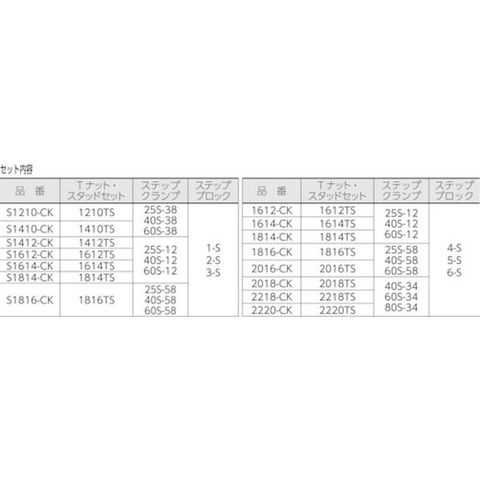 ・適合T溝幅 (mm):16・スタッドボルト:M14・Tスタット・スタッドセット:1614TS・ステップクランプ:25S-12、40S-12、60S-12・ステップブロック:4-S、5-S、6-S・適合T溝寸法(mm):16