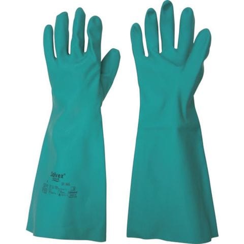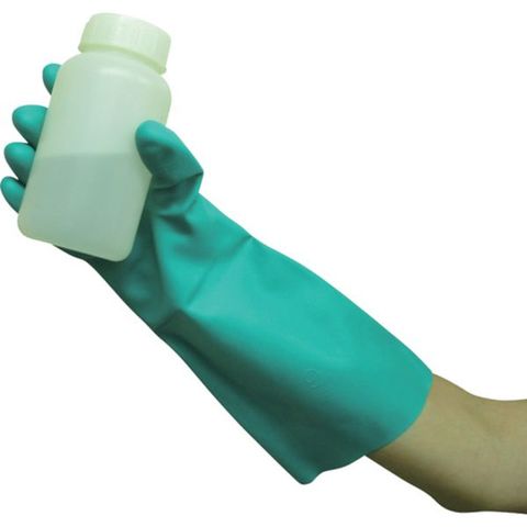 ・色:グリーン・サイズ:L・全長(cm):38.0・手のひら周り(cm):23.4・中指長さ(cm):8.1・厚さ(mm):0.6・EN374規格:メタノール、水酸化ナトリウム(苛性ソーダ)40%、硫酸(96%)