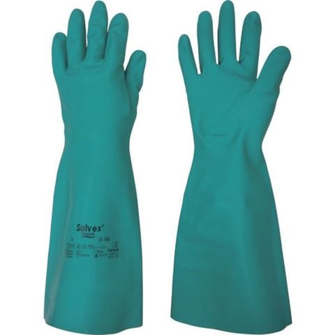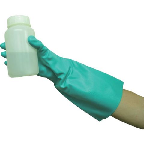 ・色:グリーン・サイズ:M・全長(cm):38.0・手のひら周り(cm):21.4・中指長さ(cm):7.4・厚さ(mm):0.6・EN374規格:メタノール、水酸化ナトリウム(苛性ソーダ)40%、硫酸(96%)