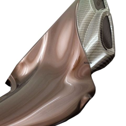インテーク部と称される前方部は綾織カーボンファイバー、後部のサイドカバー本体部はFRPのグラスファイバーを使用するハイブリッド構造。FRPのボディ本体は、各純正同等色の塗装仕上げです。