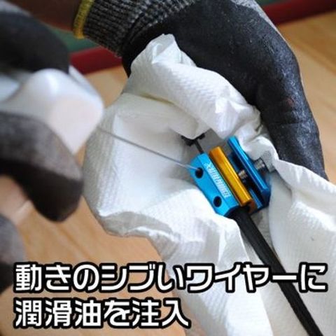 ・ブレーキやクラッチのアウターワイヤー内に潤滑油を注入することができる専用工具です。・アウターワイヤーを挟み込み、注入口から潤滑油を注入するだけで、インナーワイヤーに直接潤滑油を送り込むことができます。