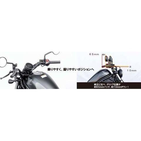 従来モデル同様に純正に比べ約65mmバックと約10mmダウンの設計で無理なくグリップを握れるポジションにしました。