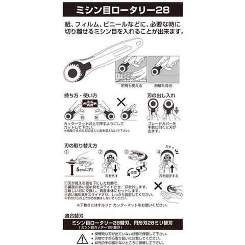 ・紙、フィルム、ビニールなどに、必要な時に切り離せるミシン目を入れることができます。・ワンタッチで刃の交換が可能です。