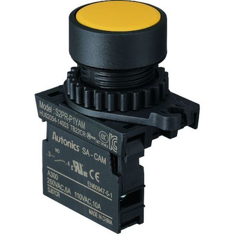 ・回路数:1・機能動作:モーメンタリー・動作:モーメンタリー・接点構成:1a・ボタン・照光色:黄・ボタン色:黄・取付穴寸法(mm):25・パネルカットサイズ(mm):Φ25.5