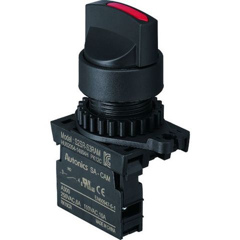 ・動作:90°2ノッチ・接点構成:1a・回路数:1・機能動作:オルタネイト・取付穴寸法(mm):25・パネルカットサイズ(mm):Φ25.5・色:赤