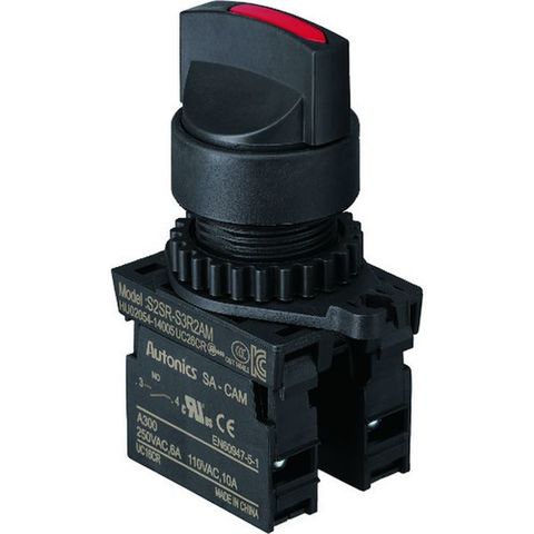 ・動作:90°2ノッチ・接点構成:2a・回路数:2・機能動作:オルタネイト・取付穴寸法(mm):25・パネルカットサイズ(mm):Φ25.5・色:赤